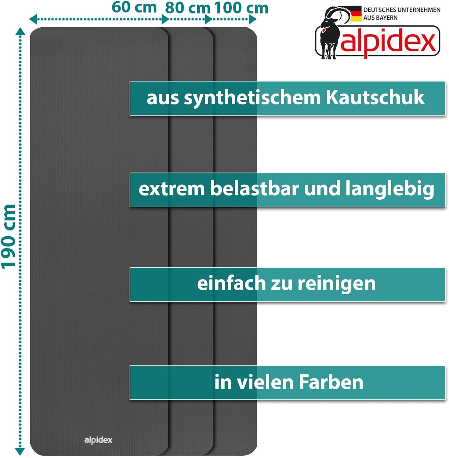 Je nach Bedarf ist die Matte in verschiedenen Breiten wählbar somit haben Sie mehr Bewegungsfreiheit um Ihre Übungen in alle Richtungen auszuführen, ohne dass Sie von der Matte begrenzt sind.